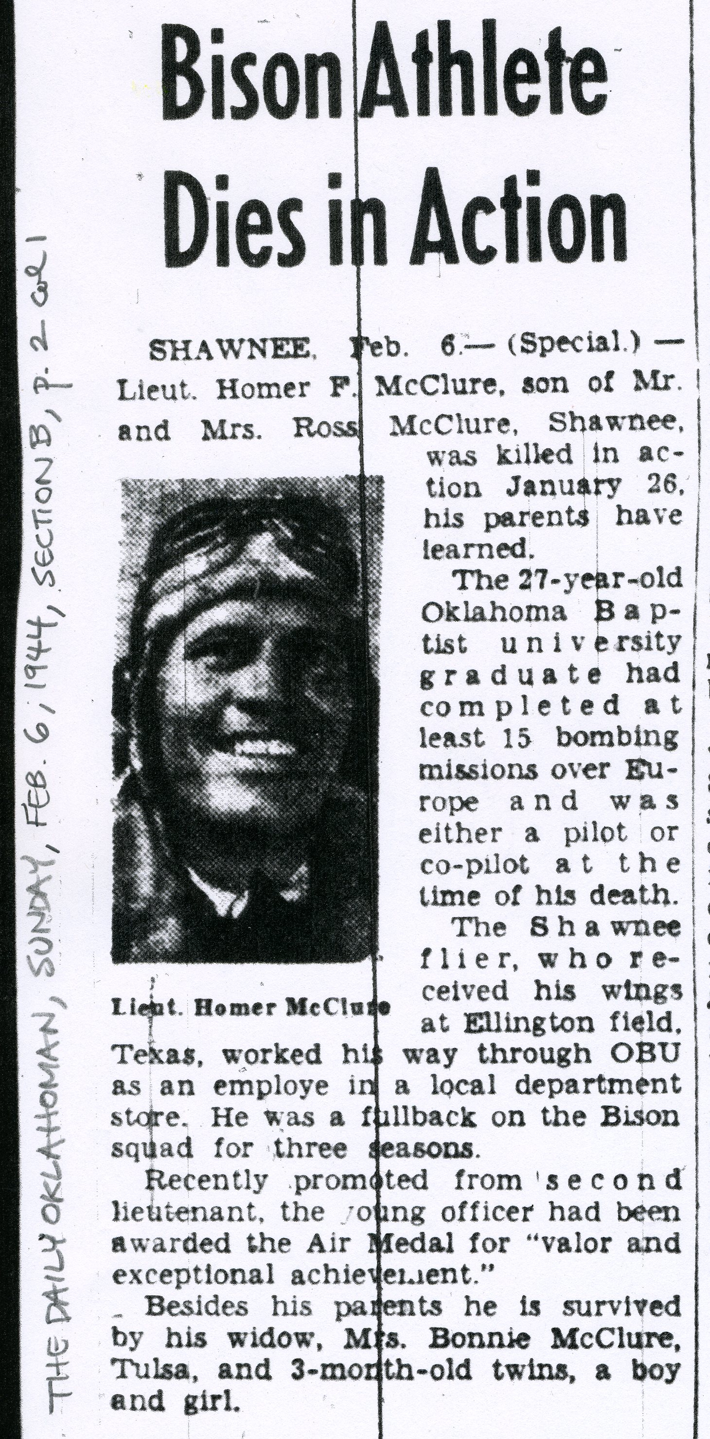 “Bison Athlete Dies in Action.” The Daily Oklahoman, February 6, 1944. Oklahoman Archives.