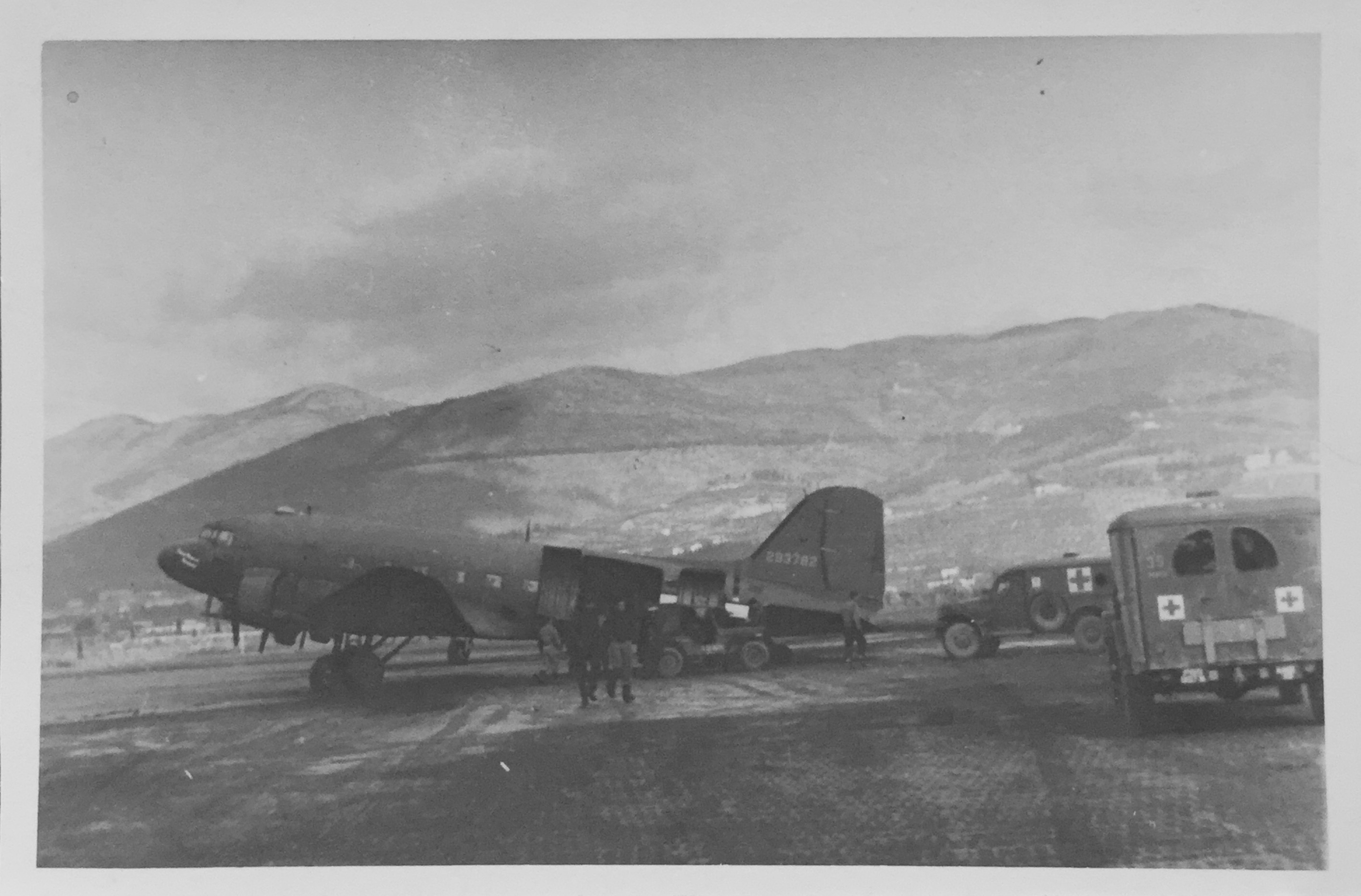 Ibid. C-47 and Ambulance, Florence Airfield. December 1944. Photograph. Collection of Bill D. Tucker Family. Lubbock, TX.