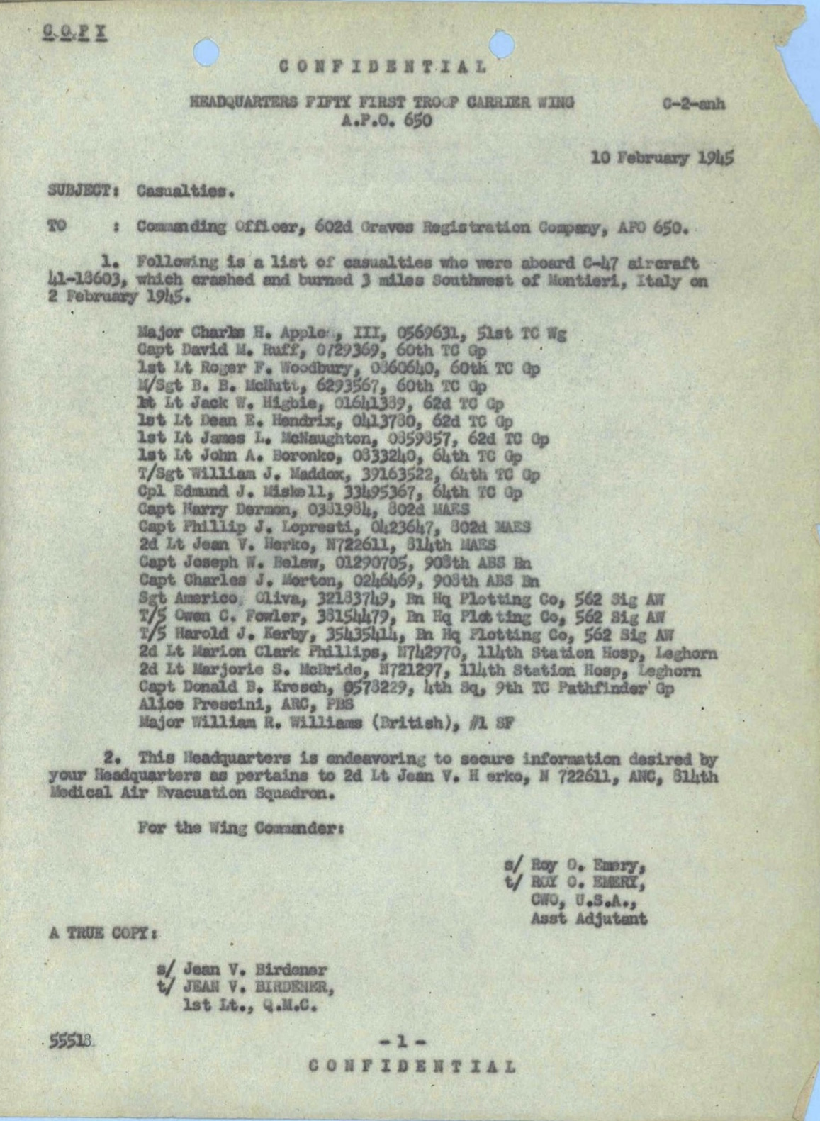 On February 2, 1945, Boronko served as co-pilot on a flight from Florence to Rome when the plane encountered heavy fog and possibly snow. The pilots tried to gain altitude, but the plane crashed into a mountain three miles from Montieri, Italy, around 10:30 a.m. The plane caught fire, and the 23 personnel on board perished. The fatalities included three U.S. Army nurses, an American Red Cross worker, a British officer, and 18 American servicemen.