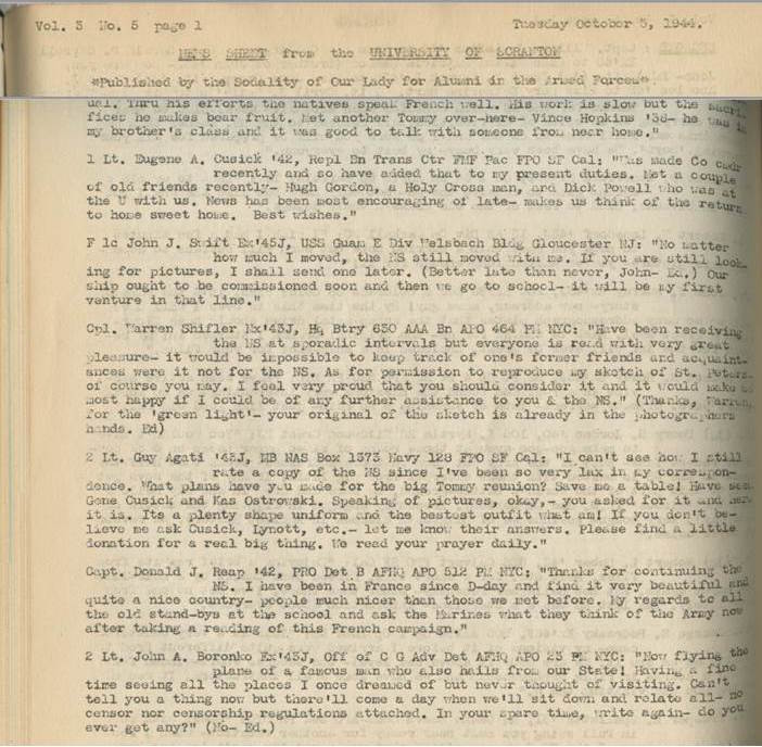 Sodality of Our Lady for Alumni in the Armed Forces. “2 Lt. John A. Boronko.” INews Sheet. University of Scranton, October 3, 1944.