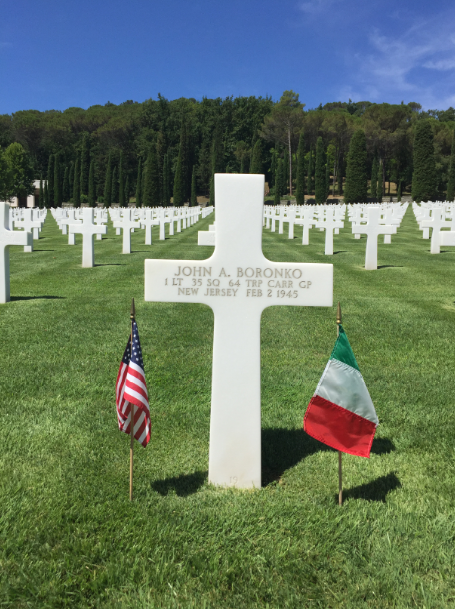 Boronko’s remains, along with those of his fellow crash victims, were initially interred at the temporary U.S. military cemetery in Follonica, Italy. Due to the nature of the crash, it took several years to positively identify his body and those of the other victims. Families faced a choice to return the remains to the United States for burial or to have them reinterred at the permanent cemetery in Florence. Mary Gretzula Bronko requested that her eldest son’s body remain in Europe. On June 13, 1949, John Anthony Boronko was buried among the Tuscan hills at the Florence American Cemetery where he lies “side by side with comrades who also gave their lives for their country.”