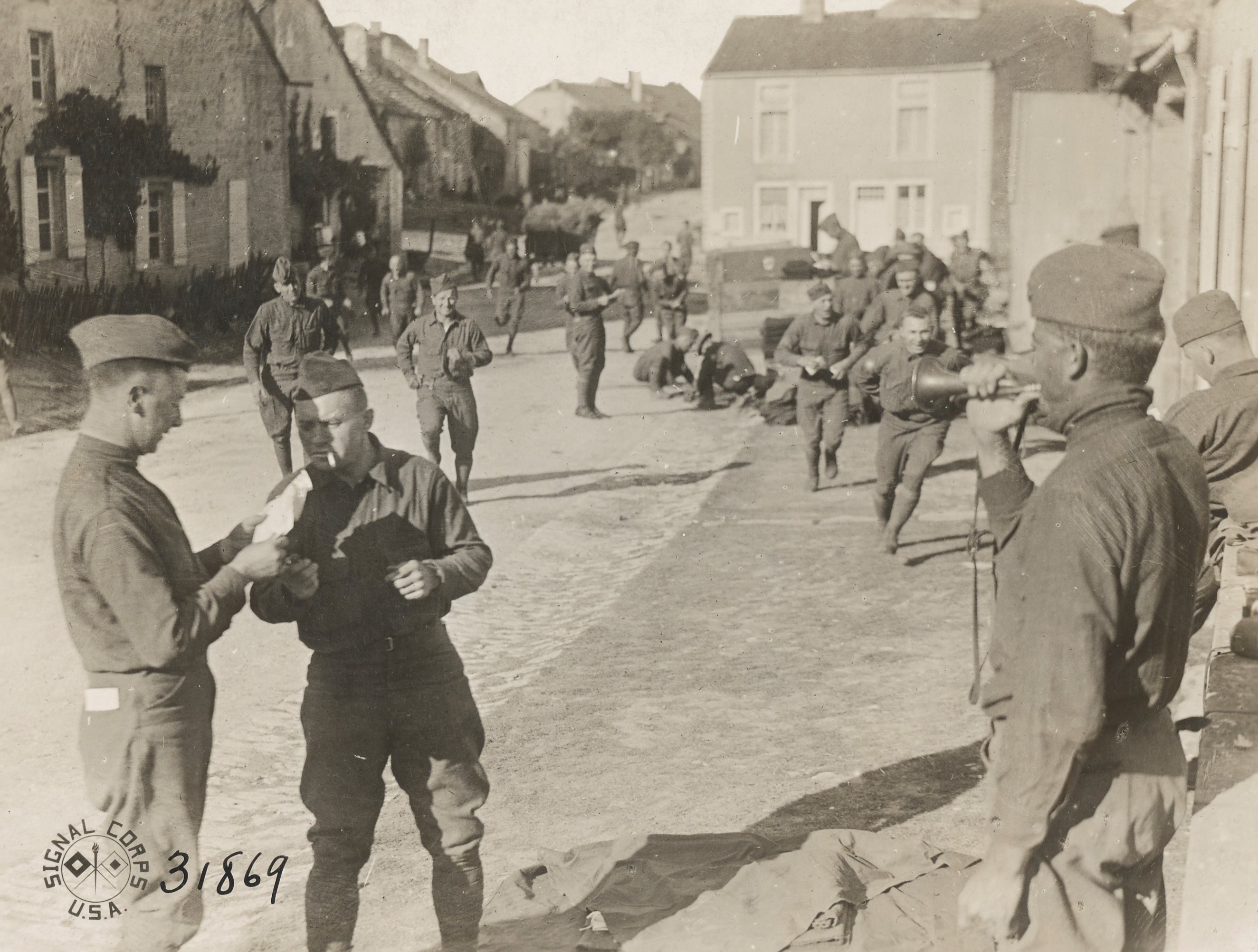 Seabrook, Sergeant First Class J. T. Bulger blowing “mail call” for men of the 91st Division…France. Photograph. September 1, 1918. National Archives and Records Administration (111-SC-31869-ac). Image.