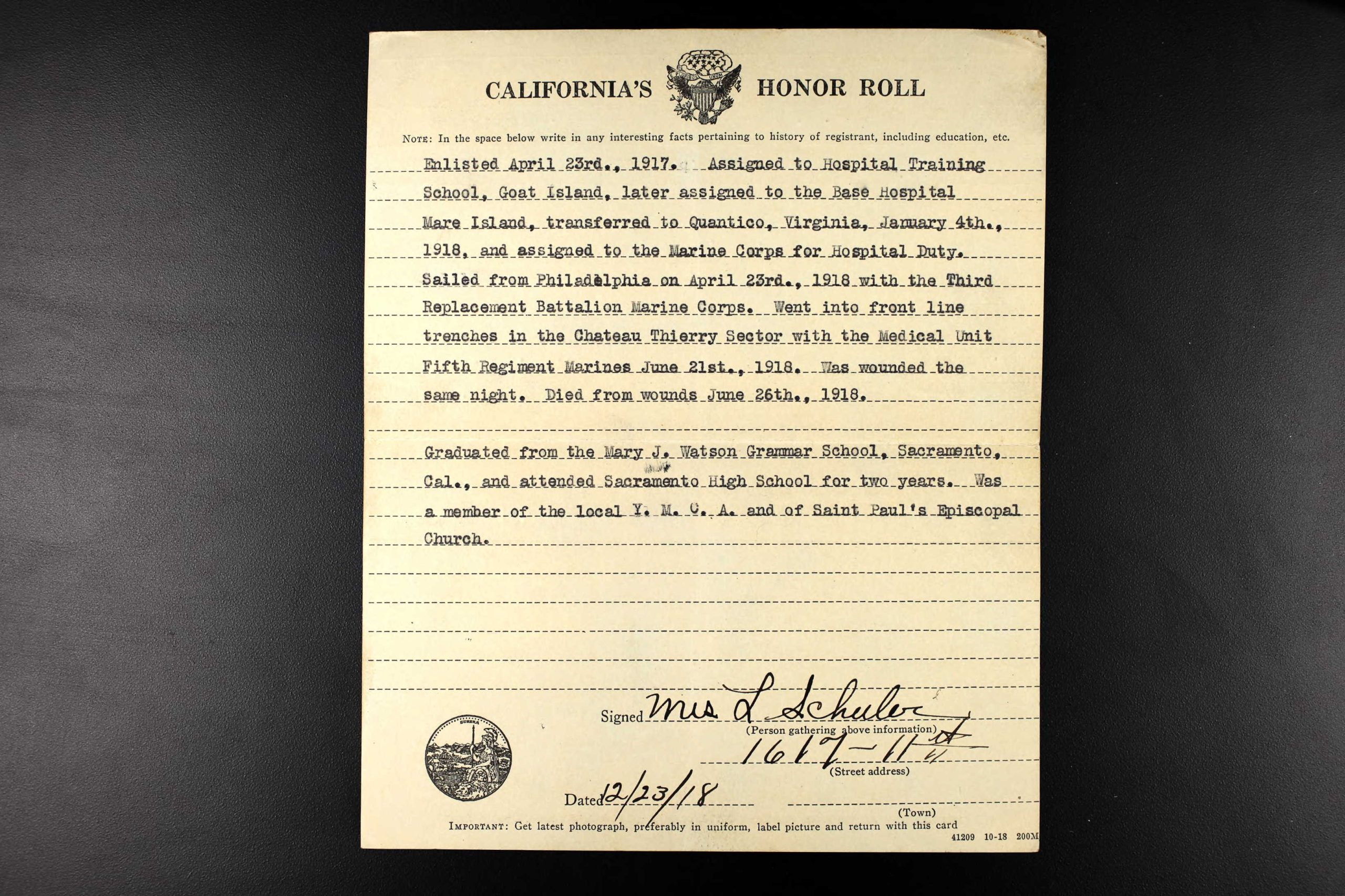 Louis Schuler’s parents, Louis Sr. and Jennie Schuler, were not notified of their son Louis’s death until months after the Battle of Belleau Wood ended. They sent inquiries to the War Department because they had not heard from their son and were worried about him. Some time later, a letter arrived from their son’s friend notifying the family of his death. The Sacramento Bee reported that his father wired Washington, D.C., to confirm this unsettling news on November 14, 1918. The U.S. Navy confirmed the report by telegram sent to the family home on November 19, 1918.