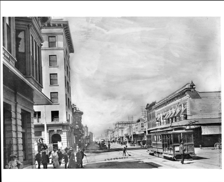 Charles C. Pierce. View of J Street in Sacramento, ca.1907. Photograph. 1907. California Historical Society, USC Libraries Special Collections (UC138398). https://digitallibrary.usc.edu/asset-management/2A3BF1VY30N?FR_=1&W=1280&H=593.