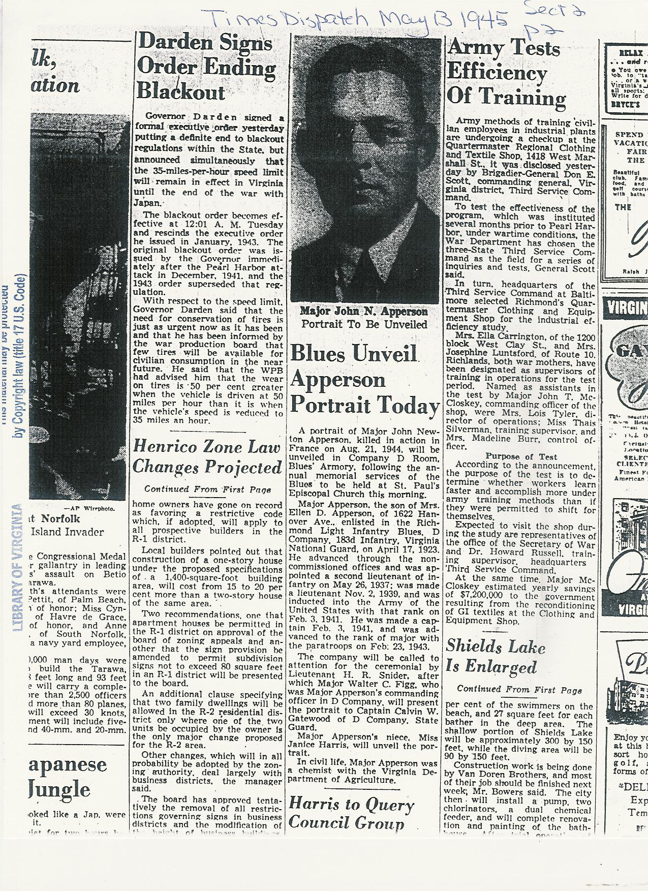 Richmond Times Dispatch. “Blues Unveil Apperson Portrait Today.” May 13, 1945.