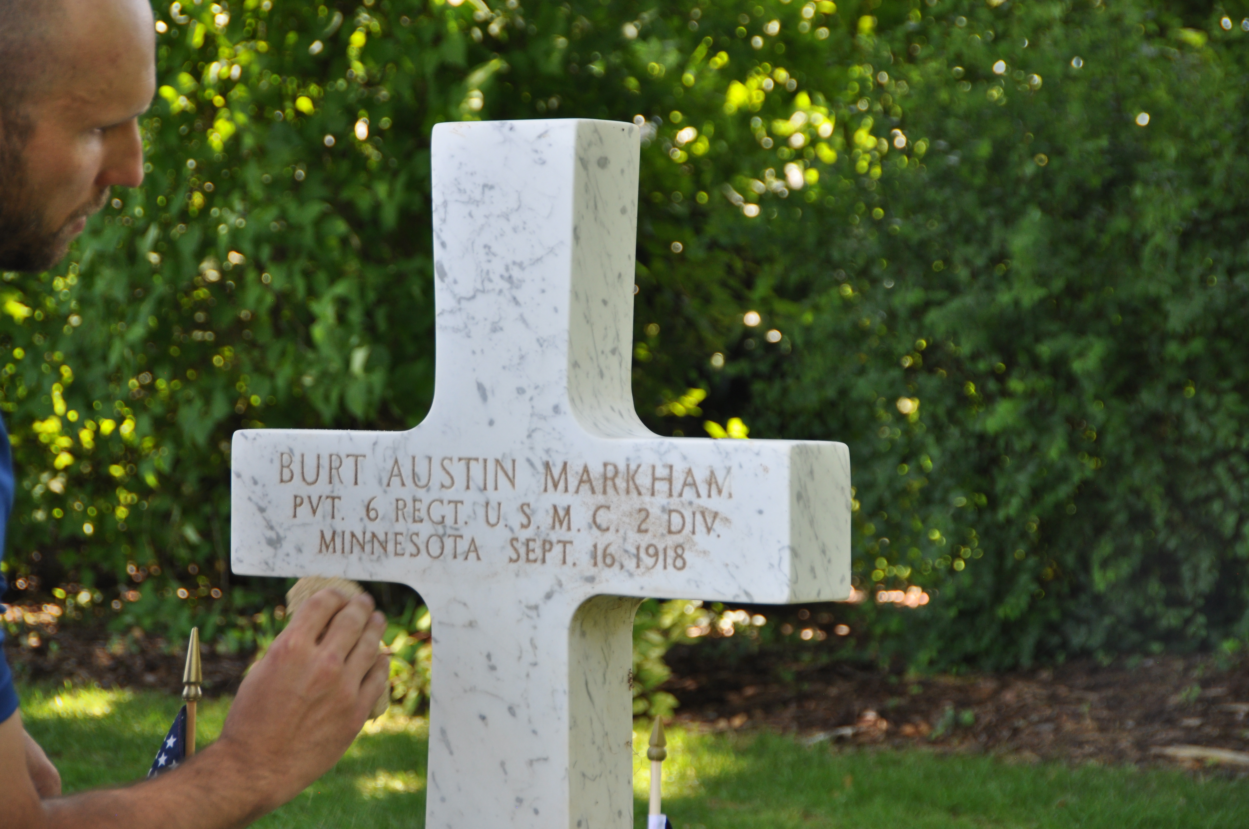 Burt Austin Markham is buried in Thiaucourt-Regniéville, France, France at the St. Mihiel American Cemetery, plot D, row 29, grave 28.
