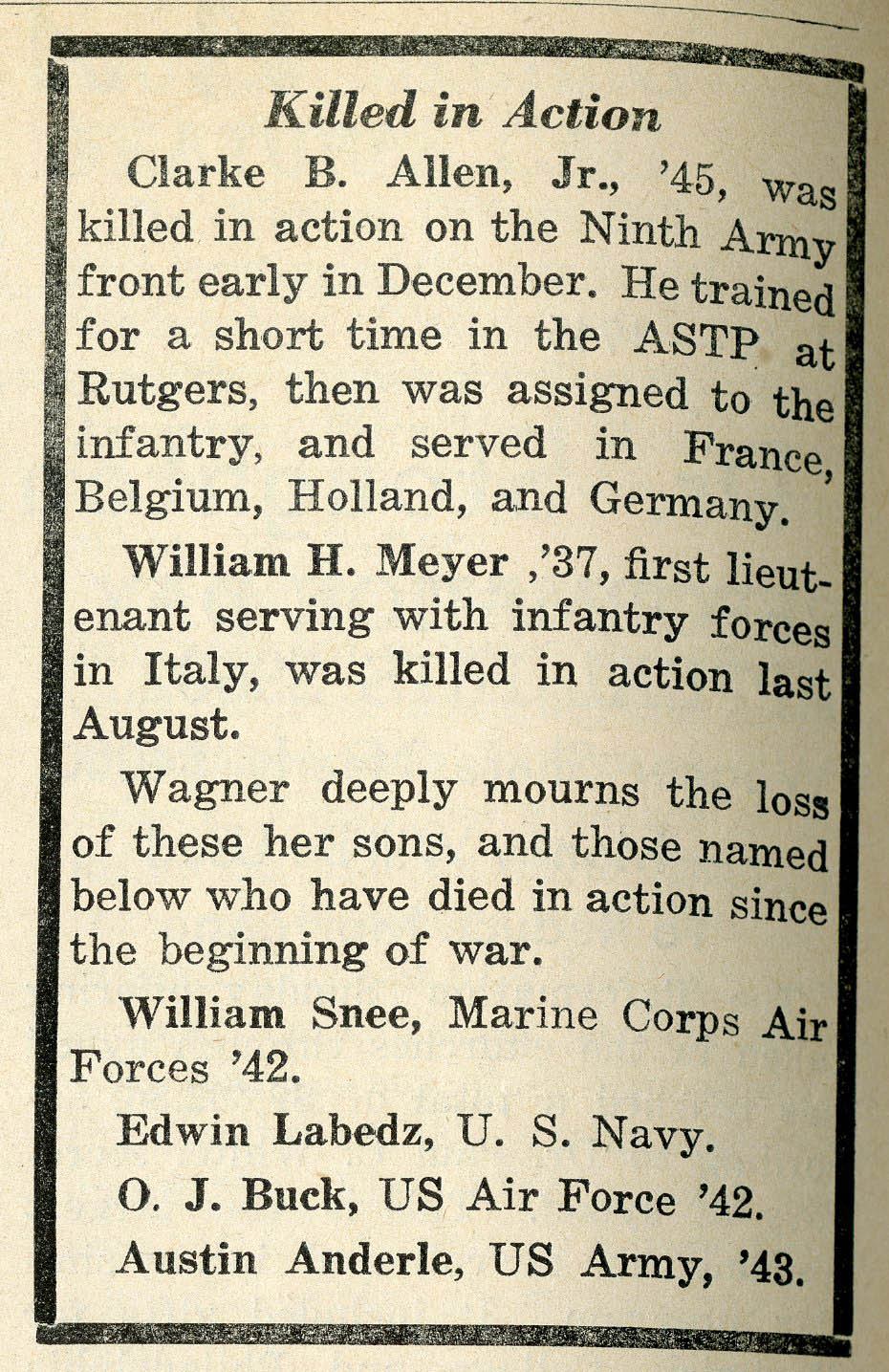 ASTP condensed a four year undergraduate course of study into eighteen months and trained enlisted men at approved colleges and universities in fields like engineering, science, and foreign language. Candidates had to qualify for the program with high test scores. Almost a year to the day after his enlistment, Clark began his studies at Rutgers University. That winter, however, increased concern from military leadership regarding a critical shortage of infantrymen on the front led to the dismantling of ASTP. Clark was “separated [from the ASTP] for the convenience of the government” in April 1944 and joined the infantry, where the need for men was more acute.