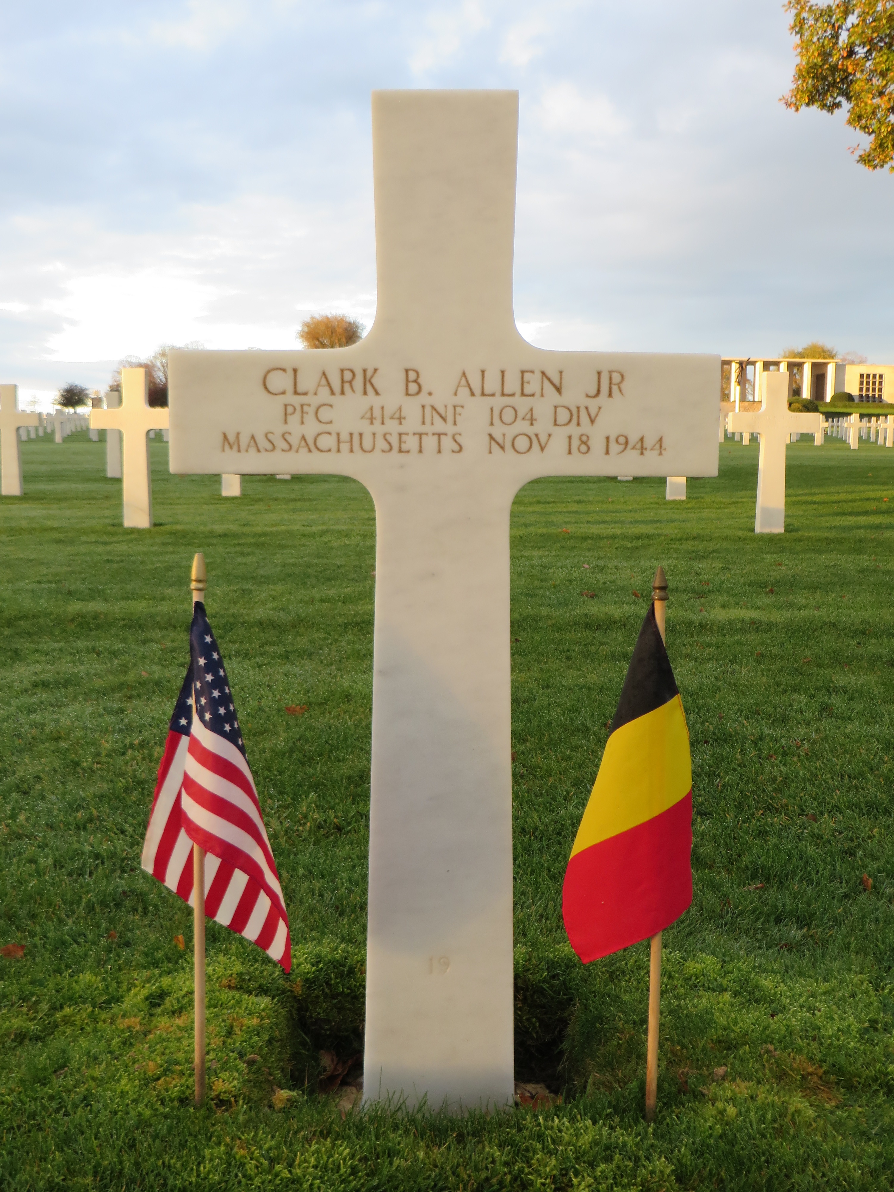 Clark’s parents received an initial telegram on December 7, 1944 informing them that their son was declared missing in action (MIA) on November 18, 1944. His status did not change to killed in action (KIA) until December 26 when his parents received a second telegram informing them that Clark had been killed on November 18. Clark was buried in a temporary grave in Belgium. After the war his parents decided to have him interred permanently at Henri-Chapelle American Cemetery where he was laid to rest in November 1948.