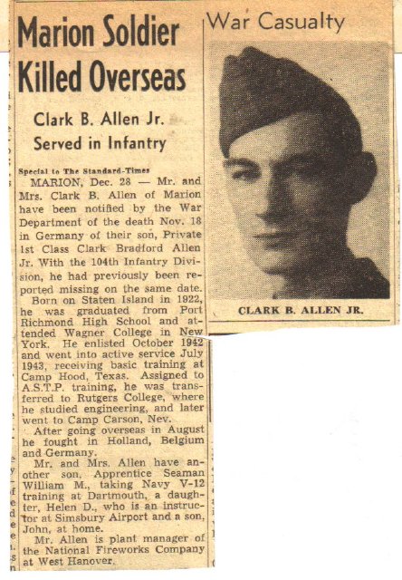 Born in Westerleigh, New York, Clark Bradford Allen, Jr. was the oldest of four children. He grew up on Staten Island, New York. After Clark’s graduation from Port Richmond High School, his family moved to Marion, Massachusetts. His father, Clark B. Allen, Sr., was an executive for National Fireworks Company in Rockland, Massachusetts. His mother, Bessie M. Allen, stayed at home to care for the children: Clark, Helen, William, and John. After high school, Clark enrolled at Wagner College. During October of his sophomore year, Clark enlisted in the U.S. Army.