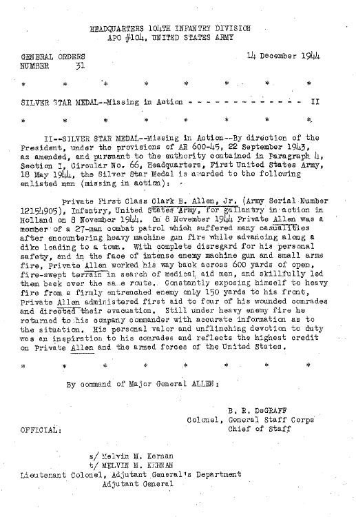 While the rest of the division moved closer to Aachen, Germany, the 414th stayed behind in Holland to shore up the town of Moerdijk. On November 8, Clark earned the Silver Star for gallantry in action, as he lived up to the motto of his division, “Nothing in Hell Can Stop the Timberwolves.” In the face of heavy machine gun fire, Clark’s 27-man combat patrol suffered heavy casualties. According to his Silver Star citation: