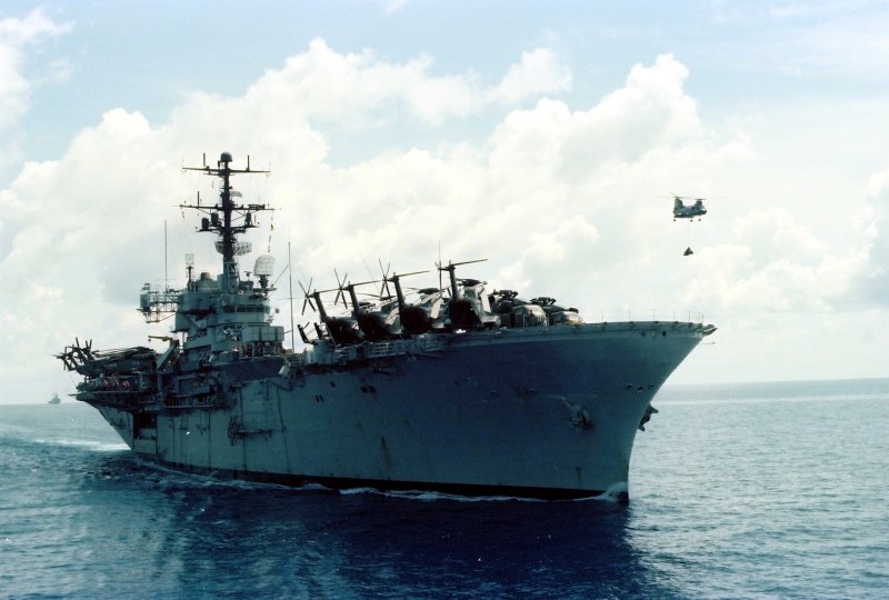USS Okinawa (LPH-3) in the Gulf of Siam during Operation Eagle Pull, 11 to 13 April 1975 conducting an underway replenishment with USS Vega (AF-59). Photograph. NavSource Online: Amphibious Photo Archive. https://www.navsource.org/archives/10/11/10110315.jpg.