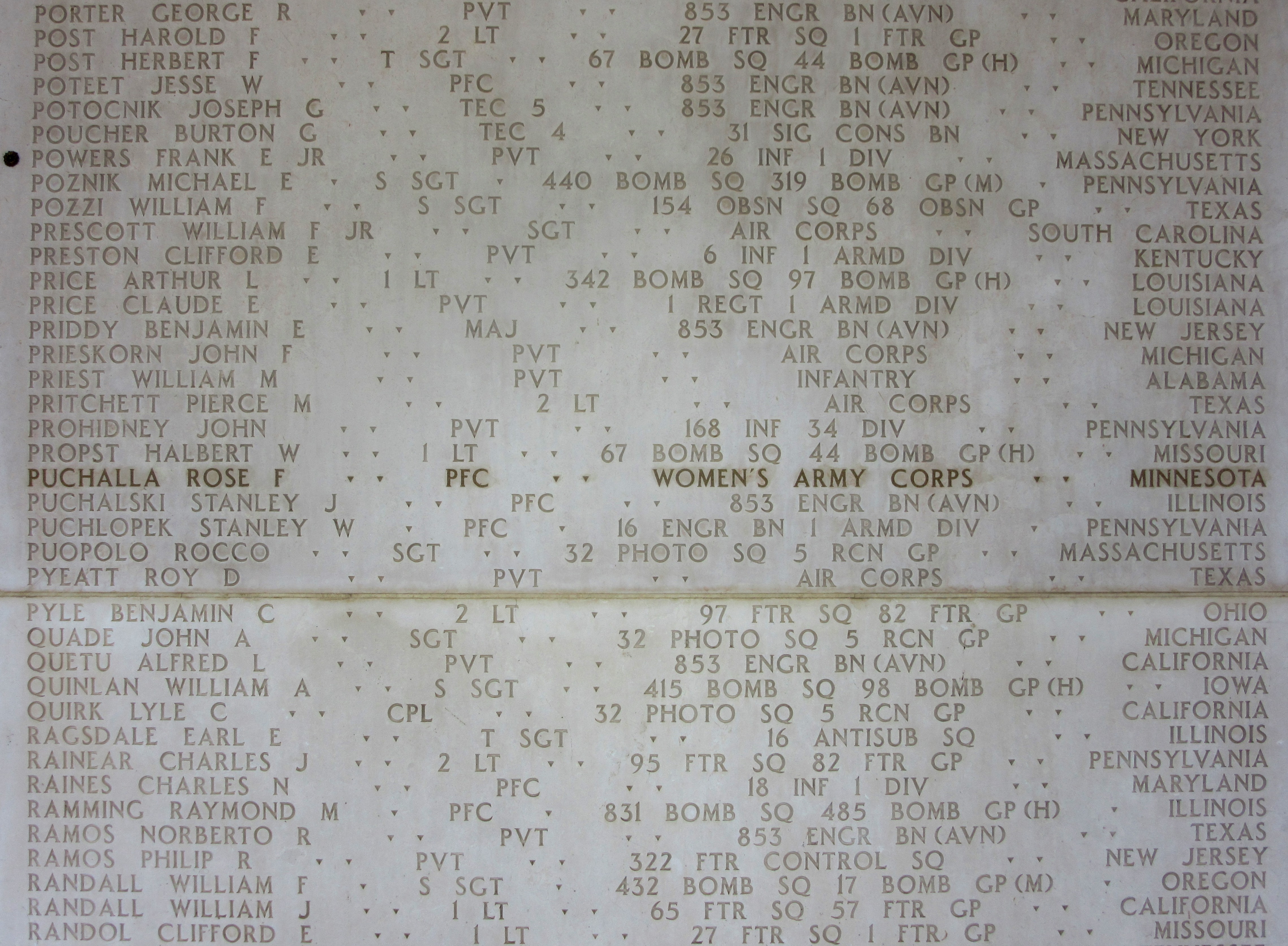 Private First Class Rose F. Puchalla’s name, along with all those lost on her flight, are commemorated on the Tablets of the Missing at the North Africa American Cemetery in Carthage, Tunisia.