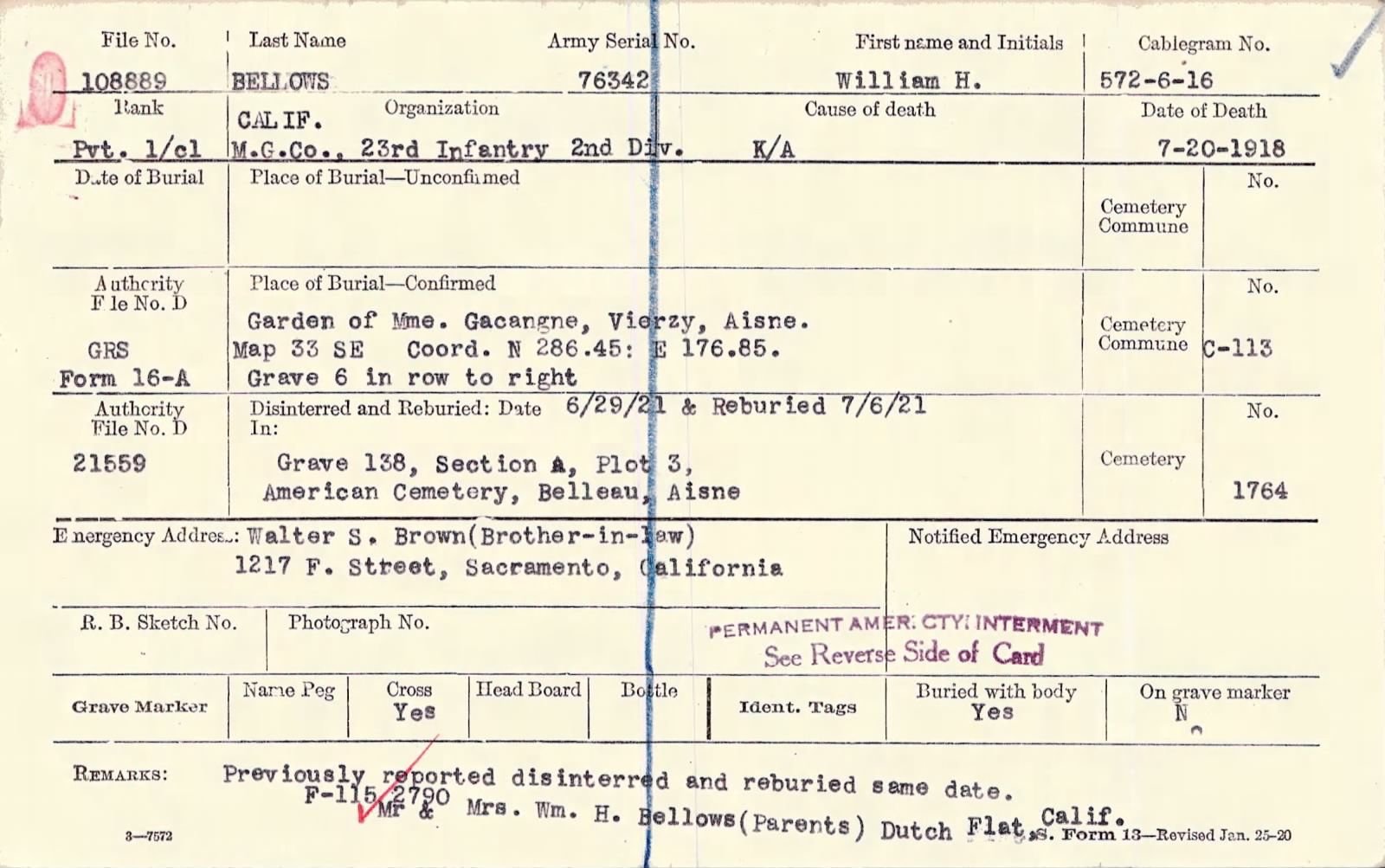 William H. Bellows. World War I Burial Cards, 1915-1918. Digital Images. https://ancestry.com.