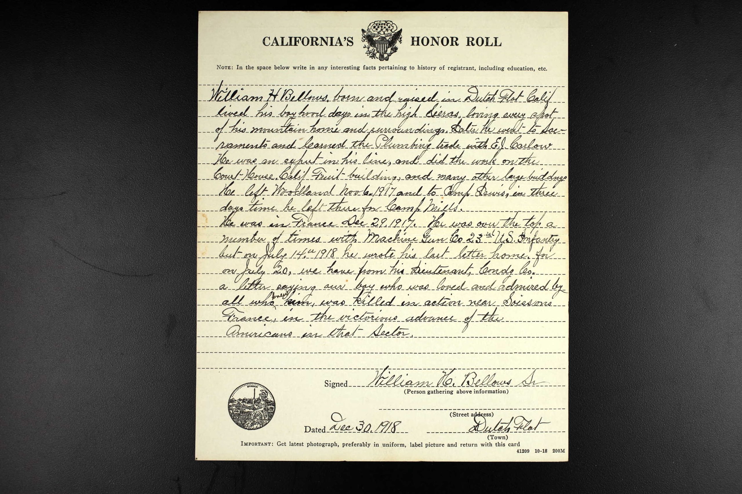 In November, the Nevada City News reported that Bellows had been killed in action near Soissons, France. However, 13 days later, another local newspaper, The Auburn Journal, reported that the War Department still listed Bellows as Missing in Action. The Auburn Journal report gave Bellows’s parents hope that their son was still alive. Nine months later, on July 4, 1919, the government confirmed the October 1918 report by Captain Richard P. Hildreth, who had since been promoted from First Lieutenant, that William Bellows had, indeed, been killed in action at Vierzy.