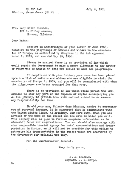 Jesse James Blanton, World War I Burial Case File; Correspondence, Reports, Telegrams, Applications and Other Papers relating to Burials of Service Personnel, Records of the Quartermaster General’s Office, 1915-1935, Record Group 92; National Archives and Records Administration – St. Louis.
