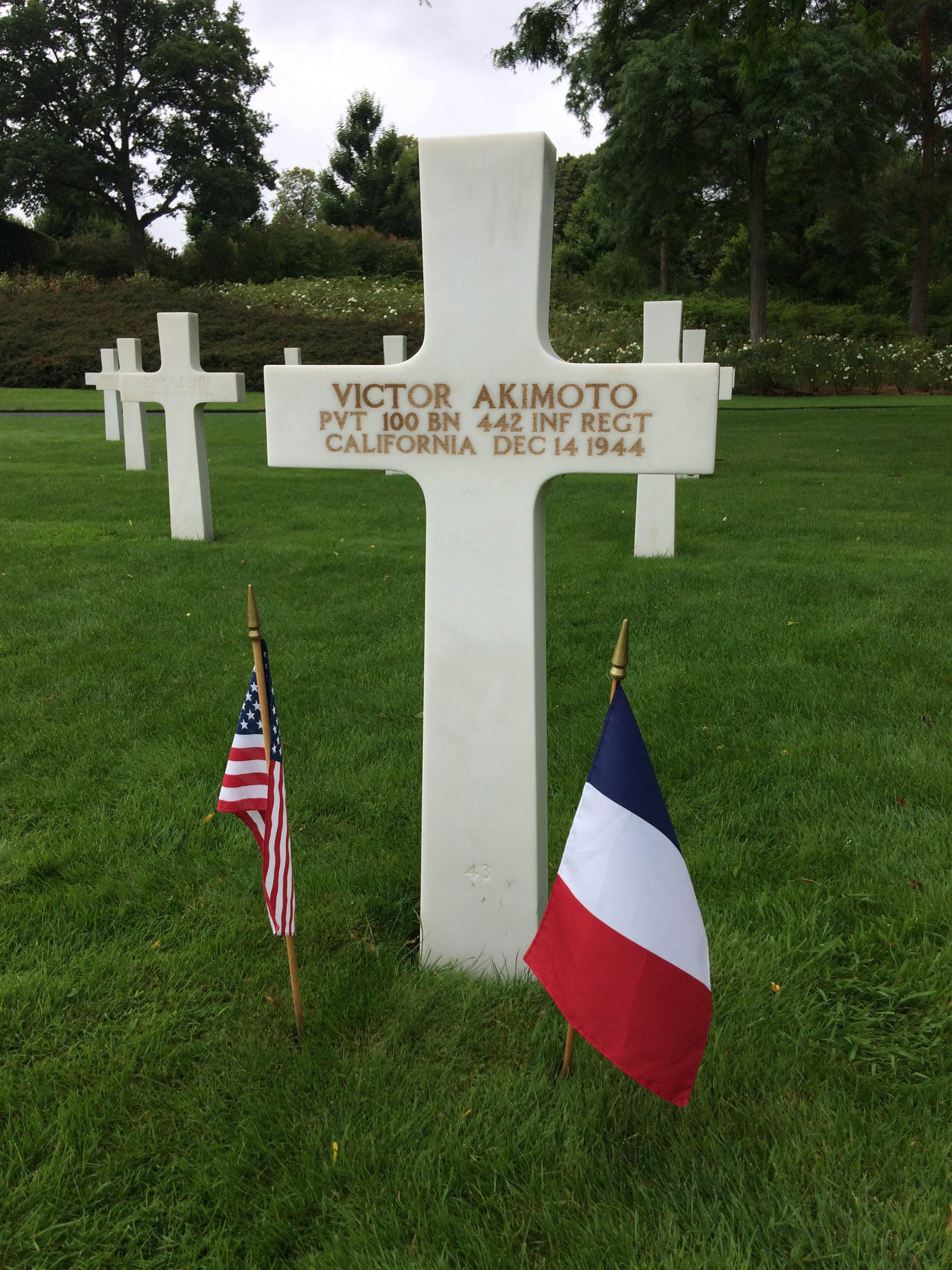 Akimoto was awarded a Purple Heart, Combat Infantryman’s Badge, Bronze Star, Distinguished Unit Badge, three Presidential Unit Citations/Distinguished Unit Badge, Expert Marksman Badge, European-African Middle Eastern Campaign Medal, and a Victory Medal. Akimoto’s contributions helped the 100th Battalion/442nd Regimental Combat Team receive over 18,000 individual decorations making them the most decorated unit in U.S. military history. He is buried next to his brother, Johnny, in the Lorraine Cemetery in Saint-Avold. They are part of a section in which 26 brothers are buried next to each other. To learn more about the Akimoto family’s experiences during World War II, please download the book, When the Akimotos Went to War.