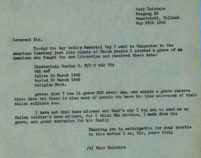 Mary Knicknie to American Graves Registration Command. 29 May 1946. Gordon C. Chamberlain IDPF File, O-542734. Department of the Army.