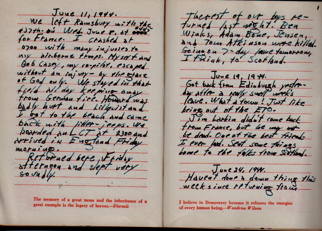 The day before D-Day, Chamberlain and his fellow pilot, Casey, tossed a coin to see which one would act as pilot; Chamberlain won the toss. He wrote in his diary, “Thirty hours from now we will make our drive. We hope God will be with all of us.” Their glider took off at 4:45 a.m. for France carrying infantrymen and heavy equipment. At 7:00 a.m. they crashed in an open field. The landing knocked Chamberlain and Casey unconscious. When they awoke they found their seats twisted to face the back of the glider; the infantrymen aboard their glider thought their pilots had been killed. Gordon and Casey delivered their troops and equipment and lay in the field for hours to avoid German fire.
