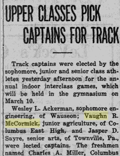 “Upper Classes Pick Captains for Track” The Lantern, March 2, 1917. The Ohio State University. digital.olivesoftware.com/Olive/APA/Ohio/#panel=home.
