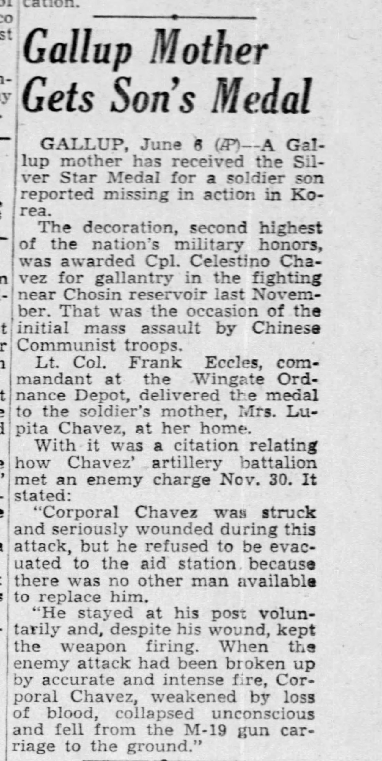 “Celestino Chavez, Missing in Action, Awarded Silver Star.” The Gallup Independent [(Gallup, New Mexico]), June 5, 1951. Newspapers.com (5934392).