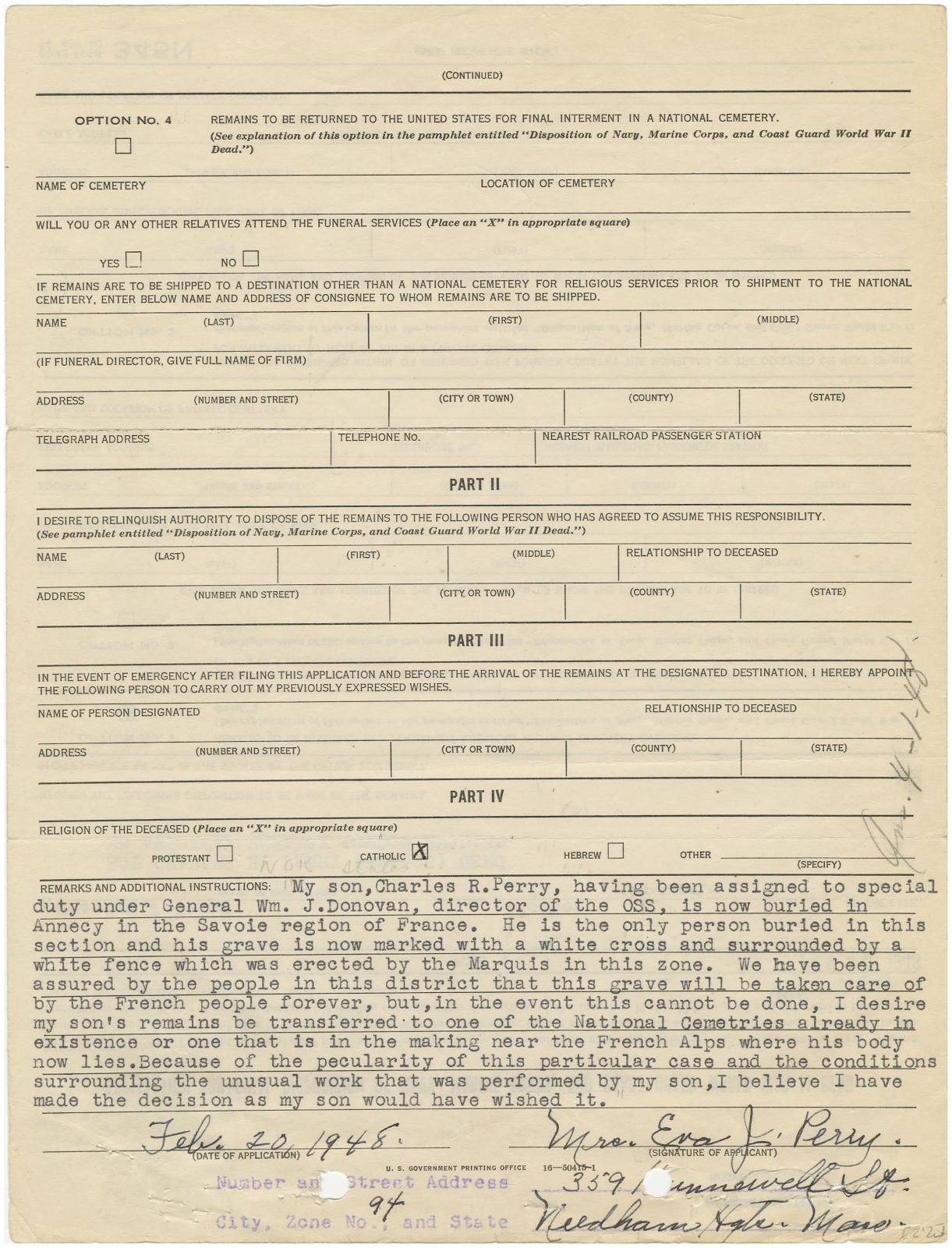 Perry’s body was recovered by local resistance fighters and buried in Annecy, in the Savoie region of France. The resistance fighters laid a white cross over Perry’s grave and built a small white fence around the site. Perry was buried with military honors, and local French women made an American flag to place with Perry’s body.