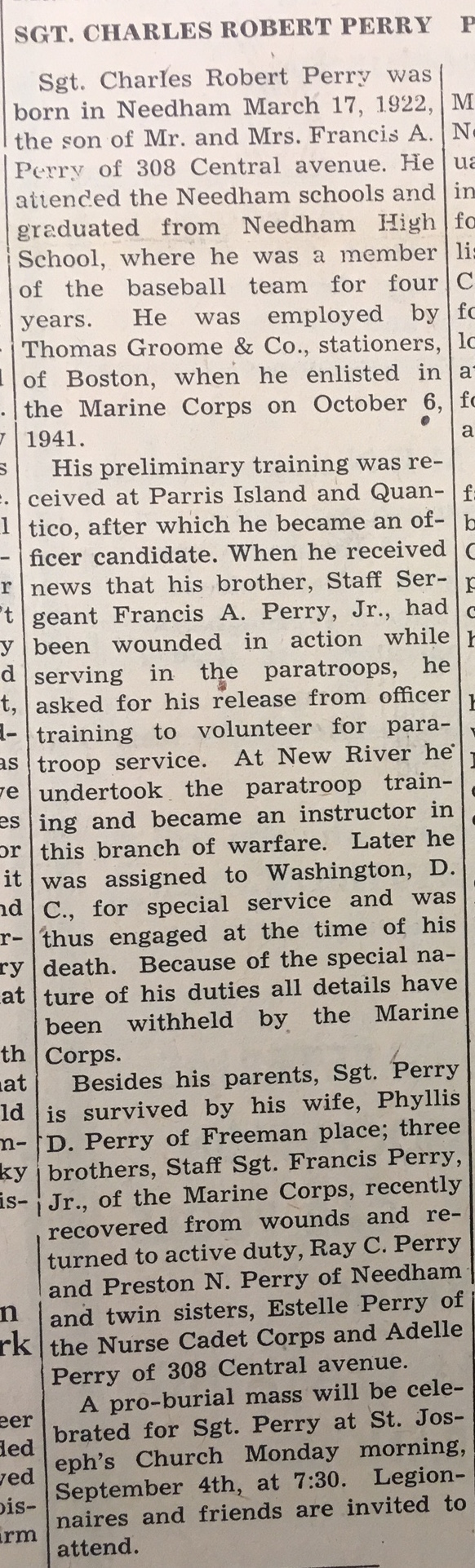 While attending Needham High School, Perry lettered in football, ice hockey, and served as captain of the baseball team. Perry enjoyed building model airplanes, hunting, skeet shooting, and horseback riding. Before he enlisted in the U.S. Marine Corps, Perry worked as a sales clerk selling stationery and office supplies at Thomas Groom & Co, Inc. When America entered World War II, Perry joined the military to fight for his country, just as his father and grandfather had done in previous wars.