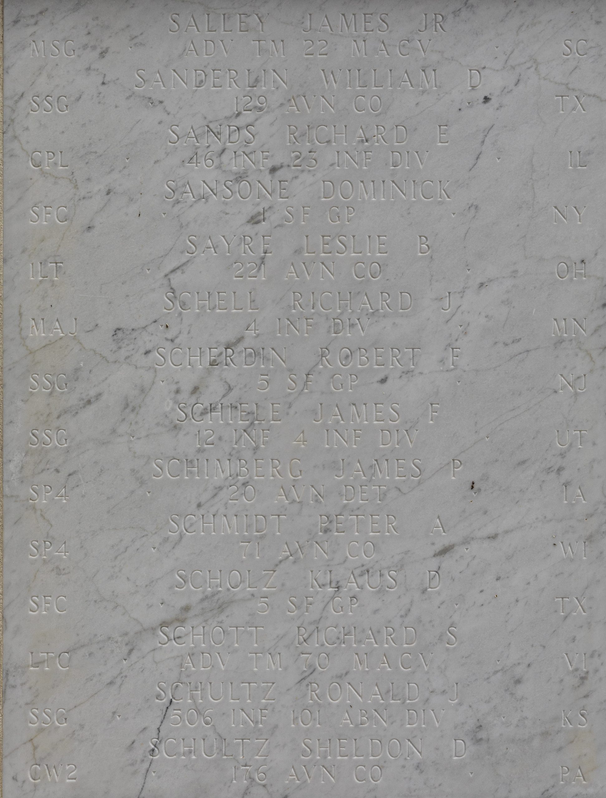 One week later, on January 8, 1969, Scherdin’s team leader, Sergeant First Class Gerald Apperson, Specialist Fourth Class Bill Williams, and a four-man Montagnard crew, returned to the area of their mission. After four days of searching, the team was extracted, but the helicopter they were traveling in crashed. The men in the chase chopper were unable to save anyone aboard, due to exploding ordnance. Once the crash site cooled, recovery teams found no evidence of Scherdin in the wreckage.