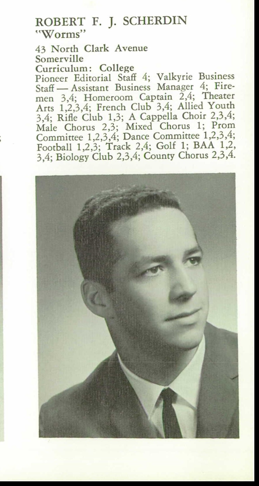 Robert Scherdin was very active at Somerville High School. He served as a homeroom captain and participated in the Firemen, a safety group at school. He ran track with his younger brother, Don, played football, and sang in multiple choruses. Continuing his interest in the military, he participated in the Rifle Club. Outside of school, Robert, his brother Don, and his cousin John hiked two parts of the Appalachian Trail.