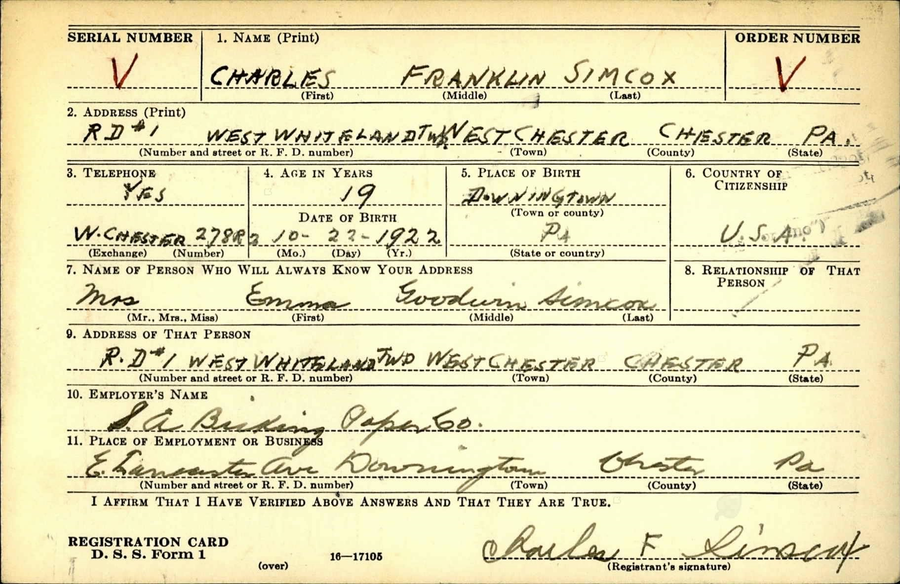 “Registration Card for Charles F. Simcox.” Downingtown Area Historical Society.