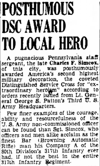 Simcox served in a unit that saw significant combat after arriving in the European Theater of Operations and suffered significant losses. In fact, 20% of the entire casualties suffered by the 80th Infantry Division were borne by the 317th Infantry Regiment in August and September. In December 1944, the regiment suffered the loss of four officers and 95 enlisted men who died during fighting that month. Simcox’s heroism and sacrifice were representative of the valor exhibited by this remarkable unit.