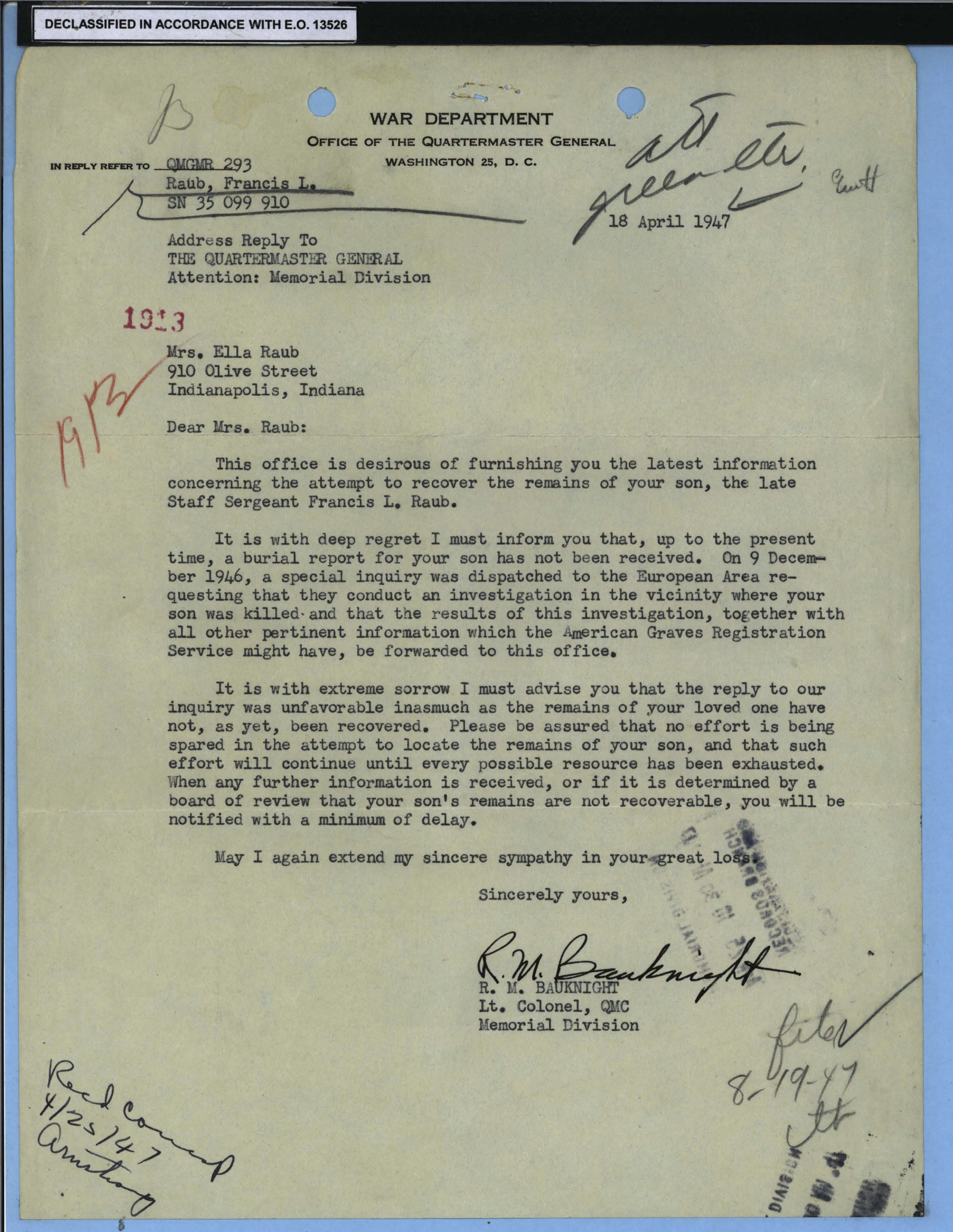 Congressman Ludlow pushed the U.S. Army to search for Francis Raub’s remains. The American Graves Registration Command sent agents to the surrounding towns where Raub was killed, but ultimately failed to locate his remains. Although the investigative team found a body, it was determined not to be Francis L. Raub.