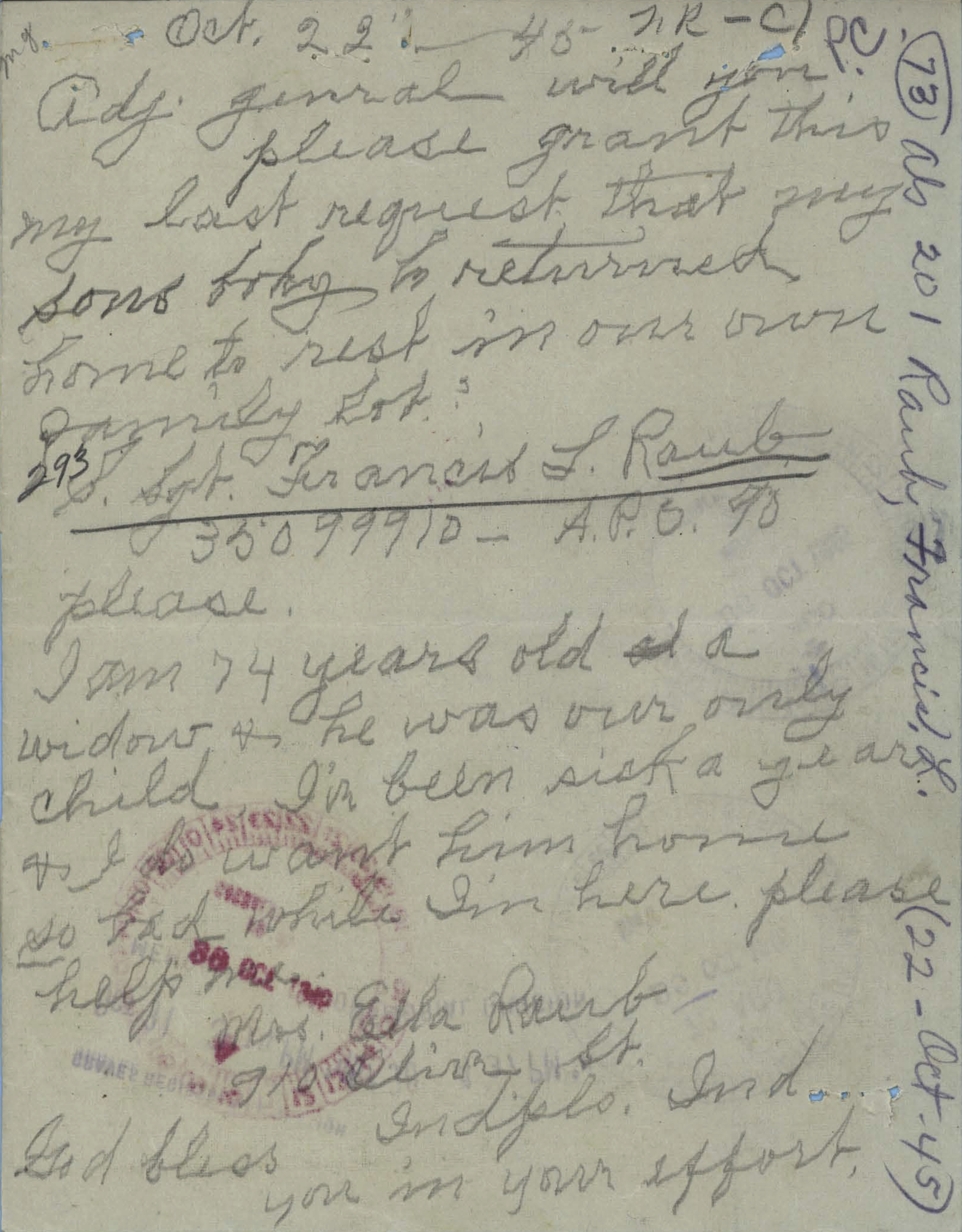 Adj. General. Will you please grant this that my lone baby be returned to rest in our family lot. Sgt. Francis Raub 3509910 A.P. O. 90. Please, I am 74 years old a widow and he is our only child. I have been sick a year and I want him home so bad while I am here. Please help. Mrs. Ella Raub Indianapolis, Indiana. God Bless you in your effort.