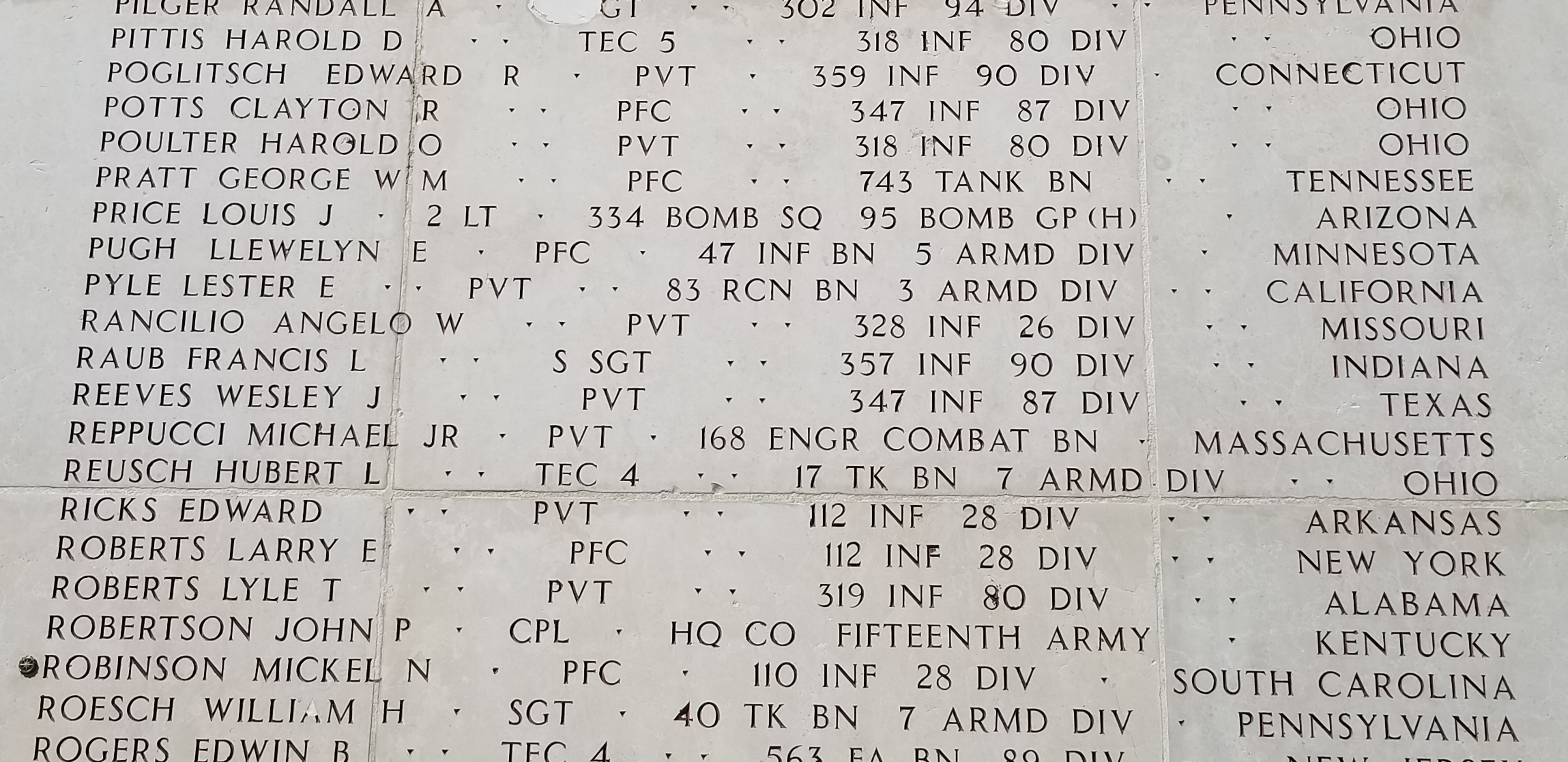 Unfortunately, the conclusion of their investigation came long after Ella Raub had died in early spring of 1946. Ruby, Francis’s wife, remarried only to divorce shortly after. She took her own life in the early 1950s. Francis L. Raub’s remains were never recovered. His only memorialization is on the tablets of the missing in the Luxembourg American Cemetery in Luxembourg.
