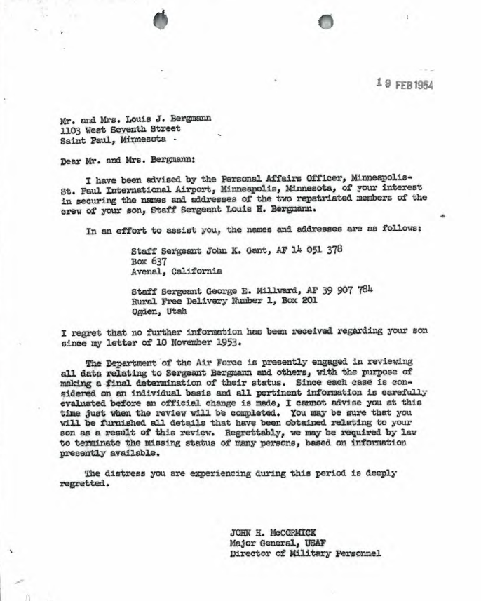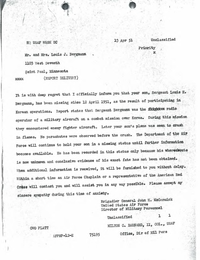 Bergmann’s parents wrote many letters to the Air Force asking for updates and information about their son’s disappearance. The family received his personal effects in July 1951.