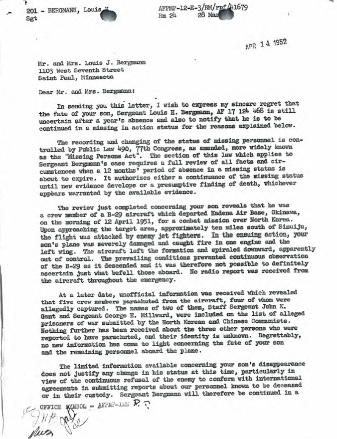 On April 14, 1952, one year after his disappearance, the Air Force sent them additional details. They declined to change Bergmann’s status at that time.