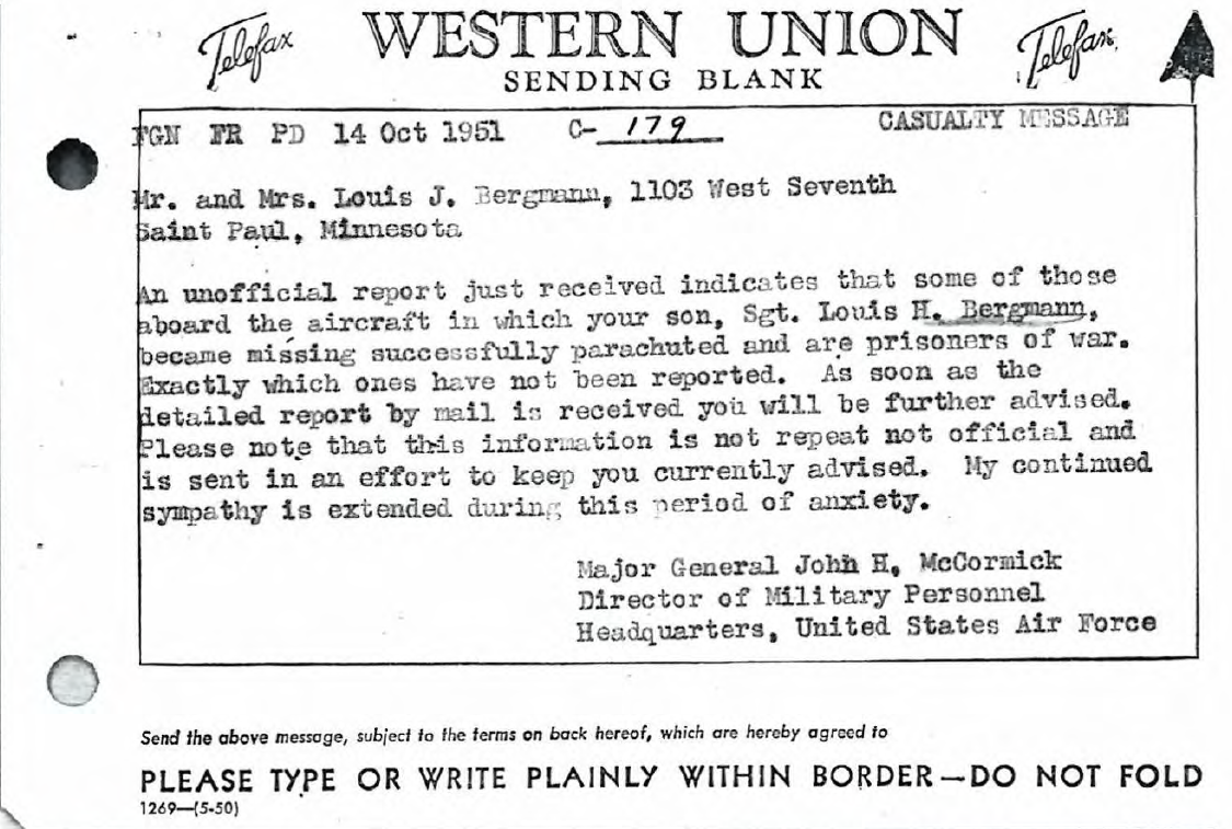 Despite the initial report of no parachutes being seen, several crew members did parachute out and were captured as Prisoners of War (POWs). On October 14, 1951, the Air Force contacted Bergmann’s parents via telegram to let them know that they had learned that some members of the crew had escaped the crash and that they were POWs, but they did not know which ones.