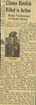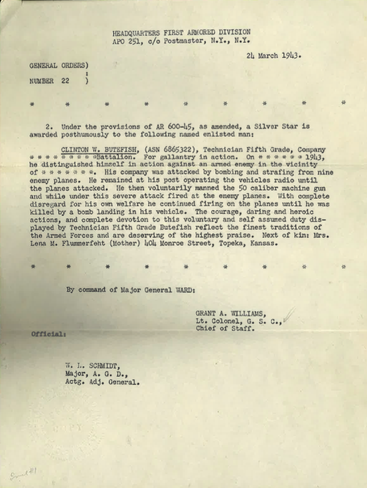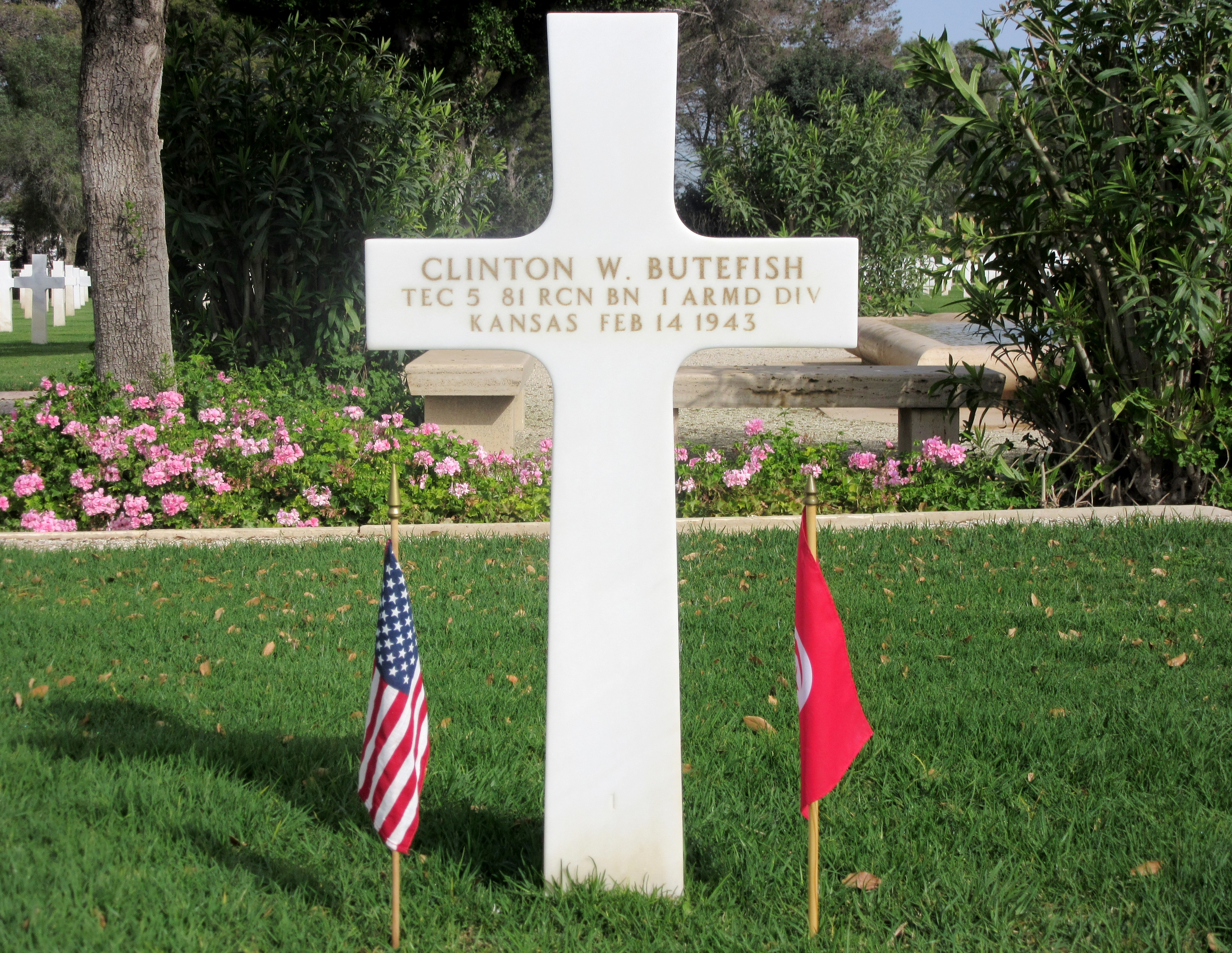 Butefish was killed in action near Faïd Pass in what would become the Battle of Kasserine Pass. The Eskridge Independent wrote, “According to reports nine enemy planes attacked the Kansan’s company, bombing and straffing [sic]. He remained at his post operating the radio in a field vehicle until the enemy planes struck, then voluntarily manned the vehicle’s machine gun until a bomb landed in the vehicle.”
