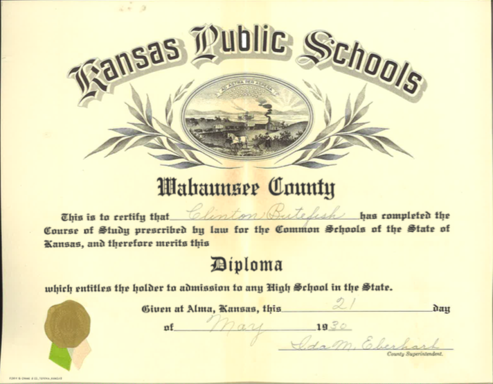 Clinton W. Butefish was born on December 1, 1914, to Roy and Lena Butefish. He grew up on a family farm north of Eskridge, Kansas. His grandparents left Berlin, Germany, in the late 1800s to immigrate to Kansas. Growing up, Butefish briefly attended school in Topeka, Kansas, before returning to the family farm in Eskridge and later entering the military.