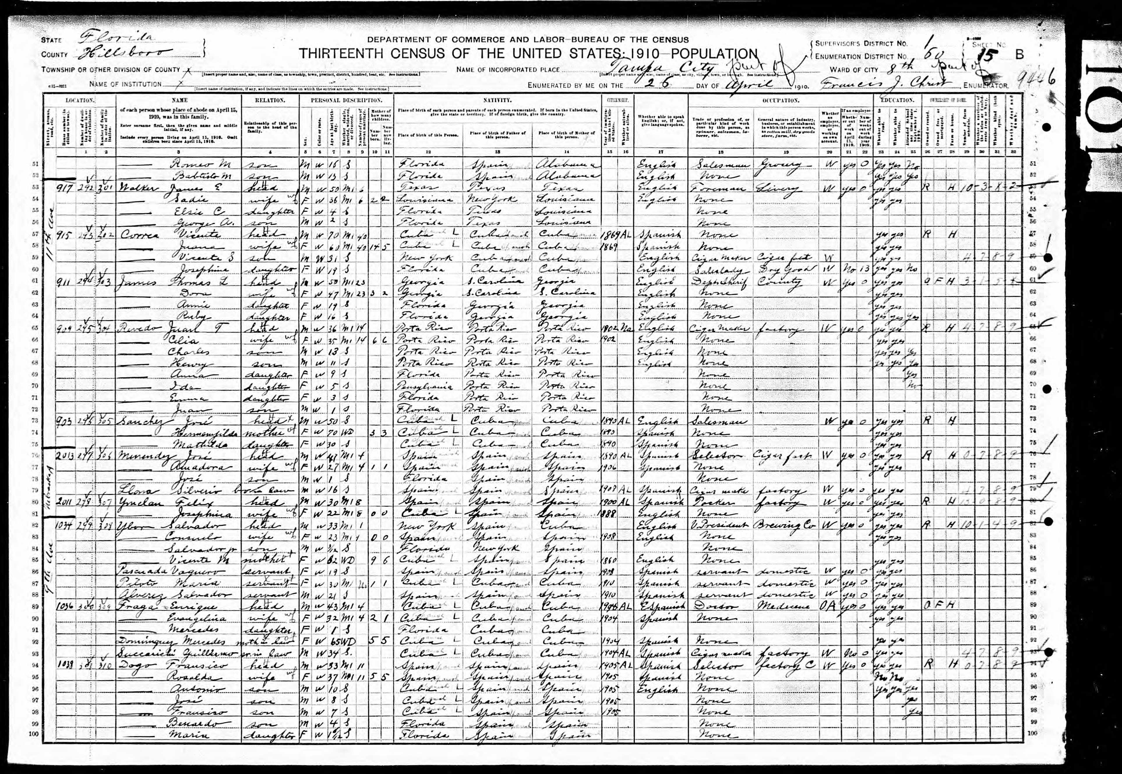 Florida. Hillboro County. 1910 U.S. Census. Digital Images. ancestry.com.