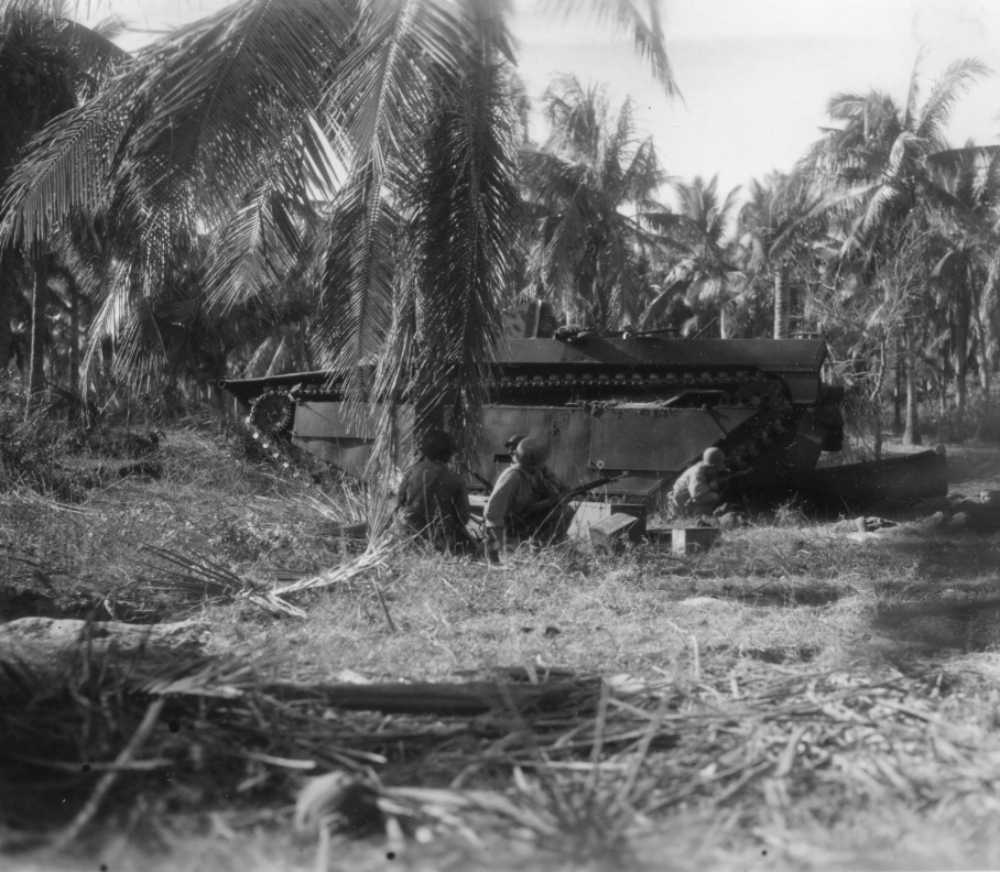 Raines, Robert. First assault waves troops of the (43rd Infantry Division) take cover behind their alligator 300 yards inland from (White Beach #9) and return enemy fire. Photograph, January 9, 1945. National Archives and Records Administration (SC 20019). Image.